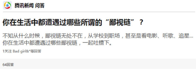 不知从什么时候,类似这种相亲的鄙视链无处不在,从学校到职场,甚至是看电影、听歌、追星...下面,跟随企鹅问答一起看看你是否也遇到过网友们在生活中遭遇过的这些鄙视链吧。