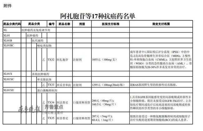 26日,山东省人社厅官网发布《关于将17种抗癌药纳入山东省基本医疗保险工伤保险和生育保险药品目录乙类范围有关问题的通知》(以下简称《通知》)。自2018年11月30日起,统一将国家谈判的阿扎胞苷等17种抗癌药(以下简称“国家谈判药品”,名单见附件)纳入《山东省基本医疗保险工伤保险和生育保险药品目录(2017年版)》乙类范围,医保支付标准、限定支付范围、药品分类和剂型等按照国家规定执行。