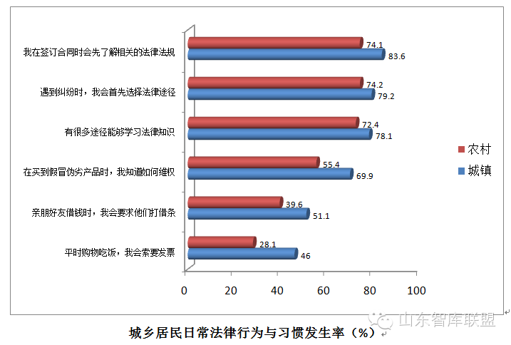 95.4%的受访者认为“自觉自愿遵纪守法是百姓的义务”,81.9%的人对现有法律法规的作用表示认可,认为“目前法律法规的制定能够将百姓的利益放在首位”,而且法律意识正在逐步渗透城乡居民的日常生活。调查显示,在问卷所设计的“有很多途径能够学习法律知识”、“遇到纠纷时,我会首先选择法律途径”等6项反映居民日常法律意识的行为和习惯中,79.2%的受访者表示在“签订合同时会先了解相关的法律法规”,76.3%和76.1%的人表示“遇到纠纷时会首先选择法律途径”和“有很多途径学习法律知识”,63.2%的人在“买到假冒伪劣产品时,知道如何维权”,而“亲朋好友借钱时,会要求他们打借条”和“平时购物吃饭,会索要发票”所占比例相对较少,分别只占45.8%和37.7%。虽然农村居民在日常工作生活中体现了一定的法律意识,表示在“签订合同时会先了解相关的法律法规”、“遇到纠纷时会首先选择法律途径”和“有很多途径学习法律知识”的人所占比例均超过70%,但六项反映日常法律意识的行为和习惯的发生率,城镇居民全面高于农村居民,总体而言,城镇居民的法律意识高于农村居民。