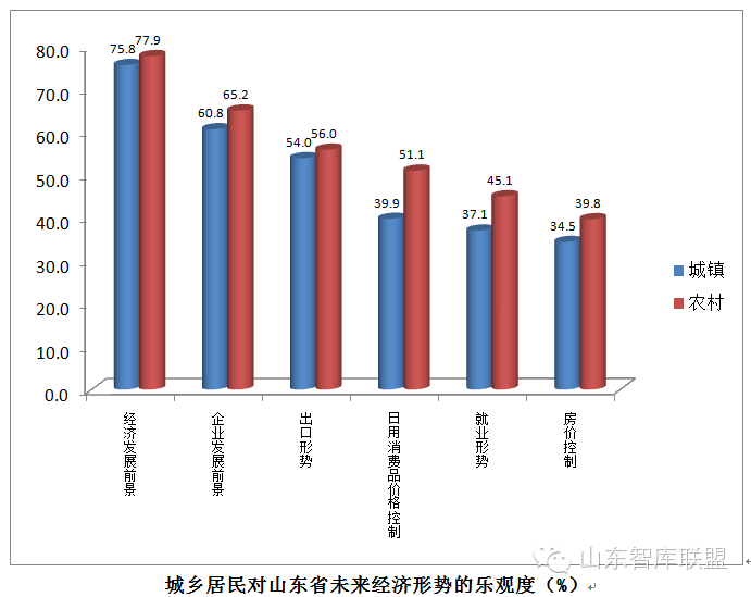 对全省未来的总体经济形势,52.9%的受访者表示乐观,其中对“经济发展前景”、“企业发展前景”、“出口形势”表示乐观的分别占76.8%、62.8%和54.9%,而对“日用消费品价格控制”和“就业形势”和“房价控制”的乐观程度相对较低,对此三项表示乐观的分别只有45%、40.8%和36.9%。调查显示,城镇居民对我省未来总体经济形势的乐观程度低于农村居民,尤其是对“日用消费品价格控制”、“就业形势”、“房价控制”三方面表示乐观的比例均不足四成。