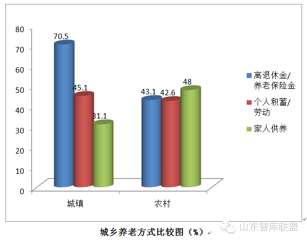 随着我省老龄化速度的加快和劳动年龄人口增长的趋缓,老年人口抚养比的上升和养老保障水平的不断提高,使全社会面临巨大的养老压力,十三五期间,养老问题将是我省所面临的重要挑战之一。本次调查显示,在“您将来打算/目前主要靠什么养老”的回答中,选择“离退休金/养老保险金”、“个人储蓄”和“家人供养”的居前三位,分别占57.8%、43.9%和38.9%,但城乡居民在养老方式的选择上还是体现了较大差异。调查显示,城镇居民中社会养老是首要选择,高达70.5%的受访者选择用“离退休金/养老保险金”养老,其次是靠“个人储蓄”和“家人供养”;但在农村,48%的受访者选择“家人供养”,家庭养老依然是农村居民首选的养老方式,而用“离退休金/养老保险金”和“个人储蓄”养老的分别占43.1%和42.6%,居第二、三位。