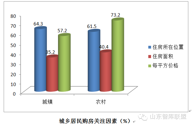 调查表明,20.9%的受访者表示会在“未来五年考虑购房”,这些具有购房意愿的人中,90.4%表示会在本市买房。关于购房时所考虑的因素,城镇居民最关注“住房所在位置”,关注此因素的城镇居民占64.3%,其次是“每平方价格”和“住房面积”;而农村居民则最关注“每平方价格”(关注率达73.2%),关注的“住房所在位置”和“住房面积”的分别占61.5%和40.4%,分列第二、三位。