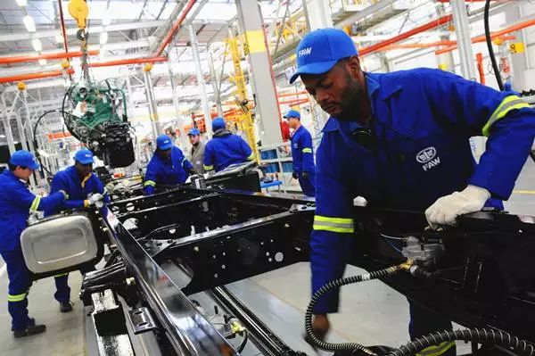 2014年7月10日,中国第一汽车集团在南非东开普省曼德拉湾市举行南非库哈工厂落成及首辆机车下线仪式。图为工人在中国一汽南非工厂生产线上工作。 (新华社记者张川石摄)