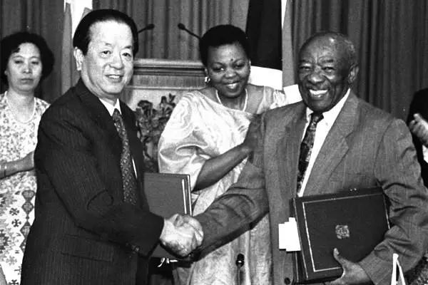 1997年12月30日,中国与南非签署建交联合公报。图为钱其琛与恩佐交换文本后握手。(新华社记者李学仁摄)