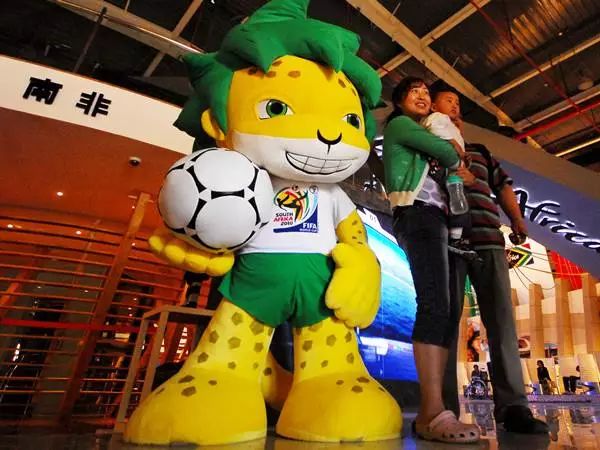 2010年5月7日,游客在世博园南非馆与世界杯吉祥物“扎库米”合影。