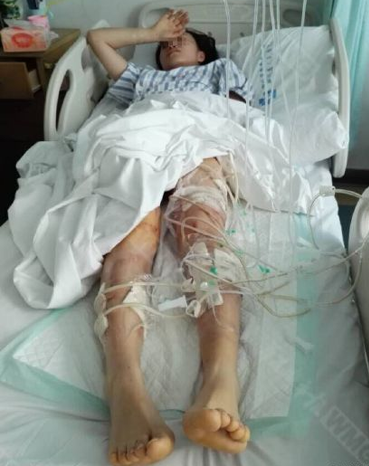 妈妈的血染红了娃娃的裤脚和T恤,娃娃大哭不已。5分钟左右,恶犬被闻讯赶来的好心人驱赶,张丹被紧急送往四川省人民医院进行手术。经过三个小时左右的清创,终于被推出了手术室。为张丹做手术的医生告诉记者,她身上有19个伤口,腿上的肉已被咬去不少,这种情况是无法缝针的。目前刚做完清创,进一步的治疗要等一周之后,看伤口恢复的情况,如果恢复得比较好就可以开始植皮,如果不够好,就还要继续清创。