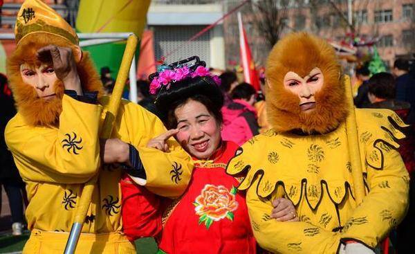 2月21日,山东滨州市博兴县举办民间艺术展演闹元宵活动,展演中各类造型五花八门,似乎“天兵天将”下凡间凑热闹。市民与真假美猴王合影。