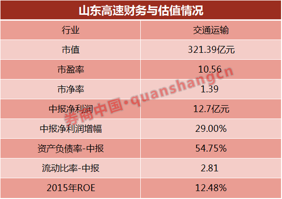 安邦保险董事长吴小晖曾公开表示,其择股标准是“ROE大于10%、市盈率小于10和市净率小于1”,目前来看山东高速基本符合这一要求。以停牌前价格计算,山东高速目前市盈率达到10.6倍、市净率为1.39倍,在盈利能力方面,山东高速2015年全年净资产收益率(ROE)为12.5%,其中销售净利率达到38.63%。
