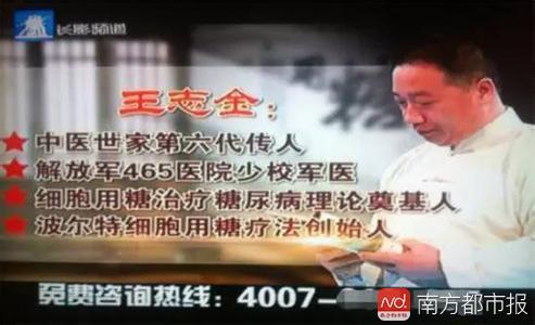 而另一位“神医”王志金的名字多变。卖安第斯玛咖片,他是王志金。卖冠心病类药物时,又变成“王志今”,在多个广告专题片里,其“百病不缠身”的口号数次出现。他曾站台的“九千堂化糖老方”,称能治疗心脑疾病和肝肾功能,但批准文号与另一款药“降糖胶囊”相撞。最终该产品因涉违法广告,被株洲市食品药品监督管理局曝光。