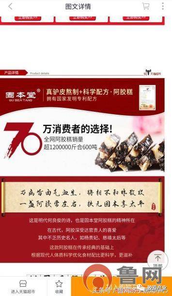 据吴先生介绍,自己在天猫商城购买的阿胶产品是济南固本堂生物技术有限公司生产的阿胶,自己是在相信天猫商城向社会承诺的“绝不卖假货”,才进行的购买,天猫超市“挂着羊头卖狗肉”的欺骗行为太让广大消费者心寒。