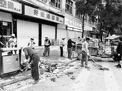 工作人员在清理街道上的垃圾 摄影/本报记者 付垚