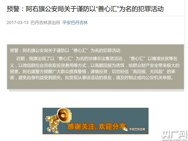 近期,内蒙古、山东、江西、贵州等多地的公安也通过各自的公众号、微博等方式提醒群众,“善心汇”以精准扶贫等名义收取投资费用,涉嫌非法集资和网络传销,提醒广大群众注意。