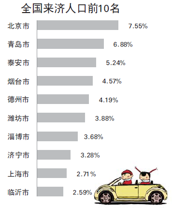 有意思的是,前十名迁入济南人口城市中,除了济宁市以外,其余城市全部位于京沪高铁以及济青动车沿线。可以看出,这些城市距离济南在国内层面不出500公里,在省内则不出350公里,印证了山东人“父母在不远游”的习俗。而且,高铁效应对济南人外出打工贡献率颇高,北京、青岛、泰安与德州,都是京沪高铁沿线站点,其中德州与泰安与济南实现了半小时生活圈,北京与青岛则纳入济南的一天生活圈,当天往返德州、泰安,周末往返北京、青岛,成为济南外漂族的标志。