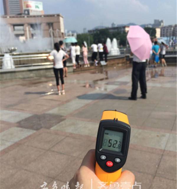 25日15时,记者携带市民常用的测量工具“红外线测温仪”来到泉城广场。当按下按钮时,显示屏上显示出52 . 8℃。齐鲁晚报·齐鲁壹点 见习记者郭立伟摄