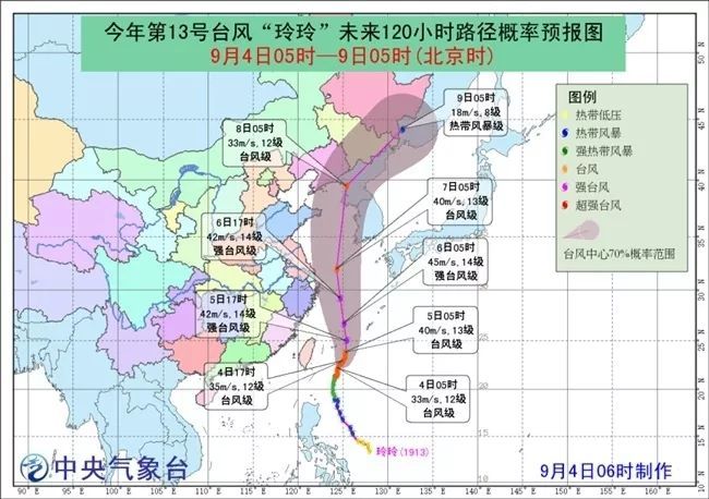 大风预报:4日08时至5日08时,南海中部和南部、北部湾、台湾以东洋面、巴士海峡、台湾岛东部沿海、东海南部将有6-7级大风,其中,台湾以东洋面的偏东海域、东海南部的部分海域风力有8-10级,“玲玲”中心经过的附近海域风力可达11-13级,阵风14-15级。