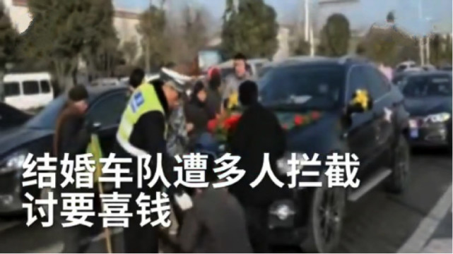 拦车讨要喜糖与红包在我国部分地区的婚礼习俗中很常见,遇到婚车从家门口经过,拦下婚车“讨喜”,沾一沾新人的喜气,而陌生人强行拦车讨要喜钱的情况也屡见不鲜。