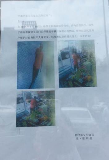 “小区业主及附近商户,您好,5月17日,该男子在我店进行行窃,店内监控拍下,该男子还有意偷窃小区门口停靠的车辆后备箱内的物品,望附近居民及商户保护好自身财产安全,以免类似事件再次发生,注意防范!”