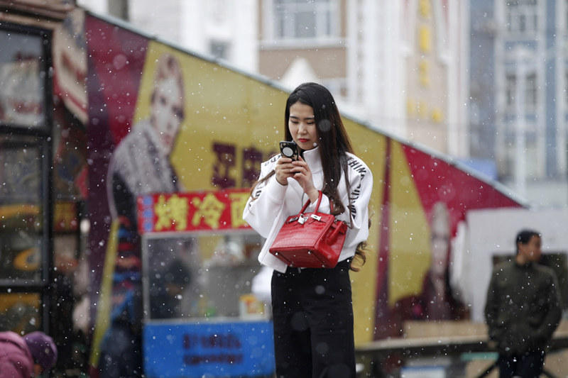 黑龙江四月降温飘雪 美女穿短裙