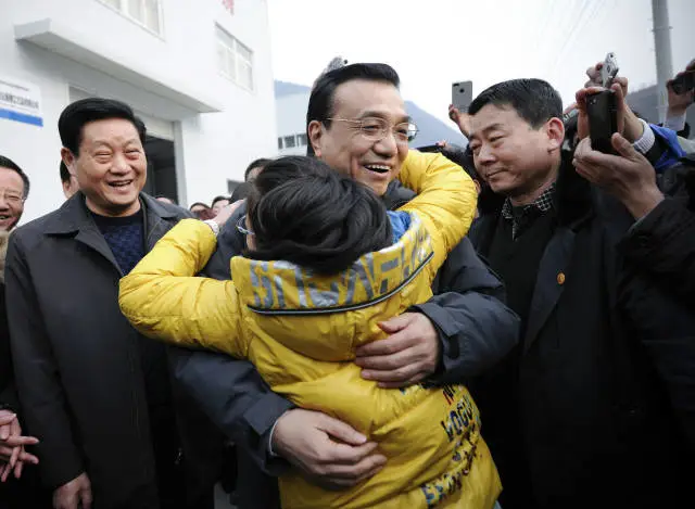 1月26日,李克强总理到陕西商洛云盖寺镇移民安置社区看望群众时,初一女孩江欣桐挤到总理面前问:“爷爷,我能抱一下您吗?”李克强笑着说:“没问题!”
